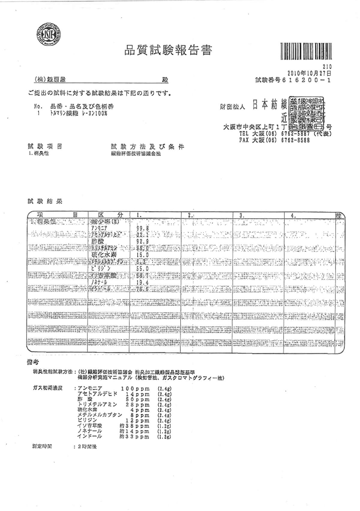 トルマリンゴに使用しているトルマリン鉱石粉末の消臭・抗菌効果を確かめるために、品質試験を通して検証いたしました。効果については様々なニオイ成分を2時間でどれだけ消臭できるのかを確かめました。